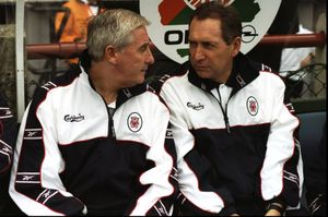 1 Aug 1998: The Liverpool management team of Roy Evans and Gerard Houllier chat on the bench during the pre-season tournament match against Leeds United in Dublin, Republic of Ireland. Liverpool won the match 2-0. Mandatory Credit: Clive Brunskill/Allsport