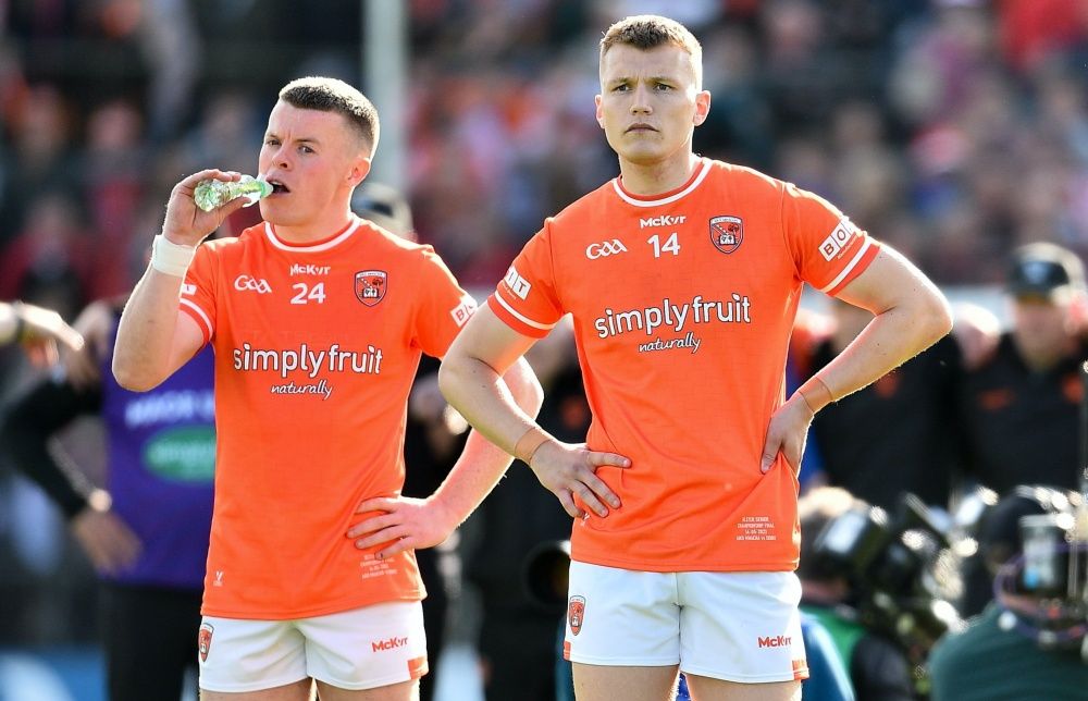 14 May 2023; Armagh joint-captains Aidan Nugent, left, and Rian O'Neill watch on during the penalty shoot-out in the Ulster GAA Football Senior Championship Final match between Armagh and Derry at St Tiernach’s Park in Clones, Monaghan. Photo by Ramsey Cardy/Sportsfile