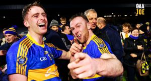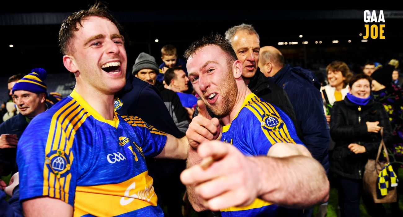 11 December 2021; Clough-Ballacolla players Eoin Doyle, right, and Brian Corby celebrate after their side's victory in the 2021 AIB Leinster Club Senior Hurling Championship Semi-Final match between Clough-Ballacolla and Kilmacud Crokes at MW Hire O'Moore Park in Portlaoise, Laois. Photo by Piaras Ó Mídheach/Sportsfile