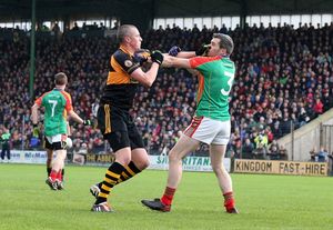 Austin Stacks’ Kieran Donaghy and Fergal Griffin of Mid Kerry involved in an off the ball scuffle