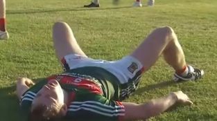 “It was like platoon there towards the end. His legs were gone and he tried to run for a ball, and in fairness to him, he got that ball, he kept going and he somehow gathered it. Then gives it away and falls on the ground, then he realises he has a free and he goes ‘shit’ we’ve a free, so he crawls off the pitch,” said Wooly.