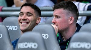 8 July 2023; Injured Limerick players Sean Finn, left, and Declan Hannon sit in the substitutes bench before the GAA Hurling All-Ireland Senior Championship semi-final match between Limerick and Galway at Croke Park in Dublin. Photo by Brendan Moran/Sportsfile