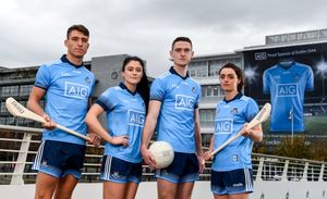 11 October 2018; Dublin stars, from left, Chris Crummey, Olwen Carey, Brian Fenton and Eve O'Brien, were on hand today to help Dublin GAA and sponsors AIG Insurance to officially launch the new Dublin jersey at AIG’s head office in Dublin. Photo by Sam Barnes/Sportsfile