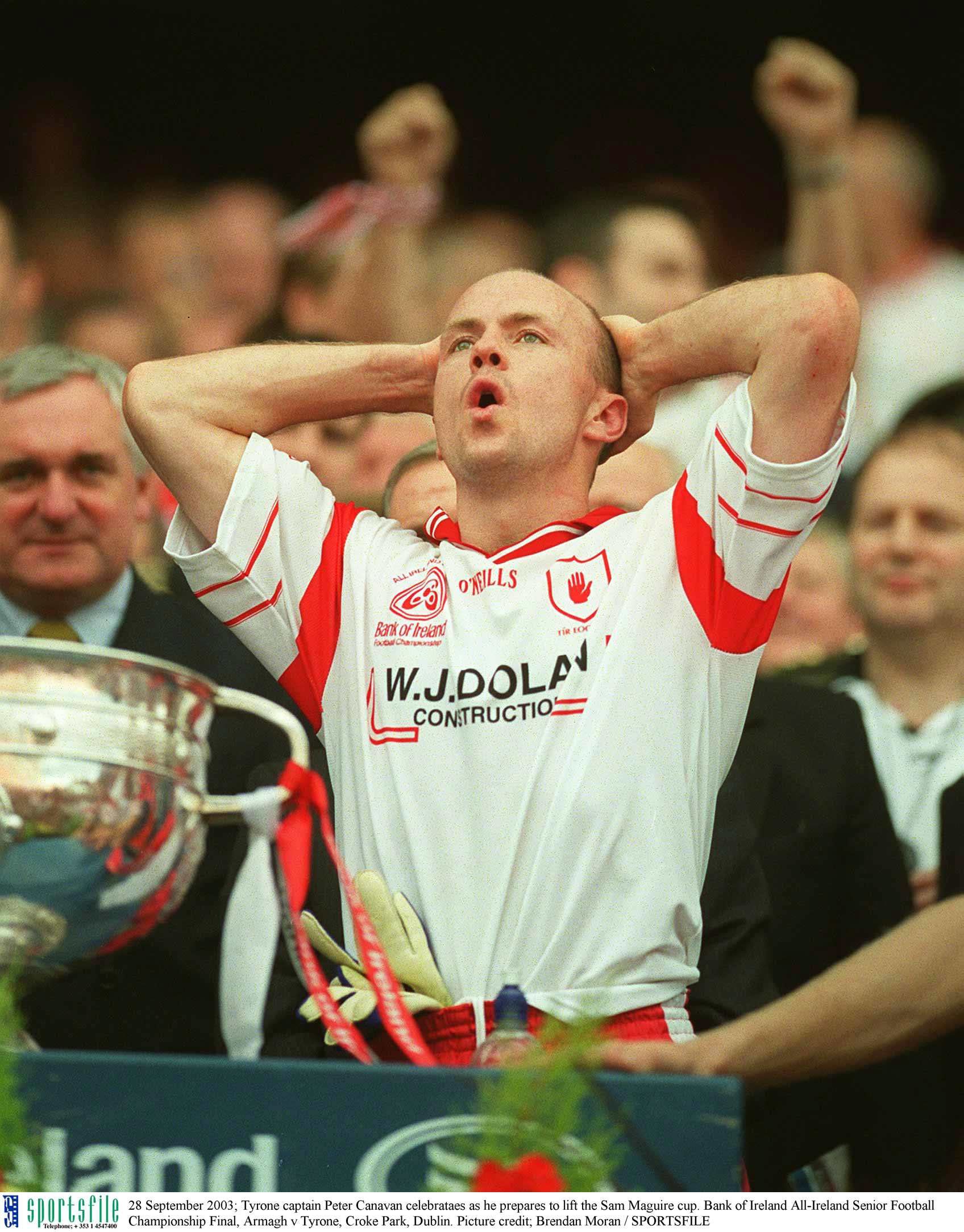 28 September 2003; Tyrone captain Peter Canavan celebrataes as he prepares to lift the Sam Maguire cup. Bank of Ireland All-Ireland Senior Football Championship Final, Armagh v Tyrone, Croke Park, Dublin. Picture credit; Brendan Moran / SPORTSFILE