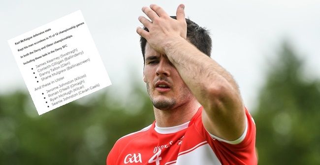 In 12 championship games across both codes – Karl McKaigue has scored 0-6 but held his direct opponent scoreless in 11 games … only Danny Toner (B’galget) scored off him #GAA @GACSlaughtneil