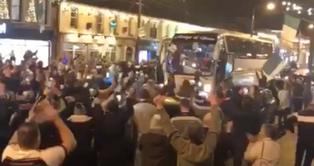 Men, women, children flooded the Newbridge streets in celebrations under the dark sky as elderly folk, kids on shoulders and grown men jumped around with their hands in the air to welcome the Moorefield bus back into town.