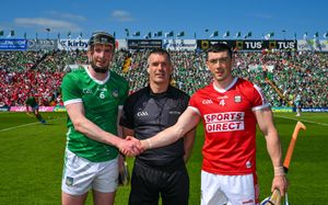 28 May 2023; Referee James Owens with the Cork, Sean O'Donoghue, and Limerick captain, Declan Hannon, before the Munster GAA Hurling Senior Championship Round 5 match between Limerick and Cork at TUS Gaelic Grounds in Limerick. Photo by Ray McManus/Sportsfile