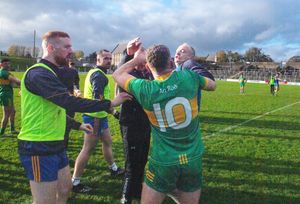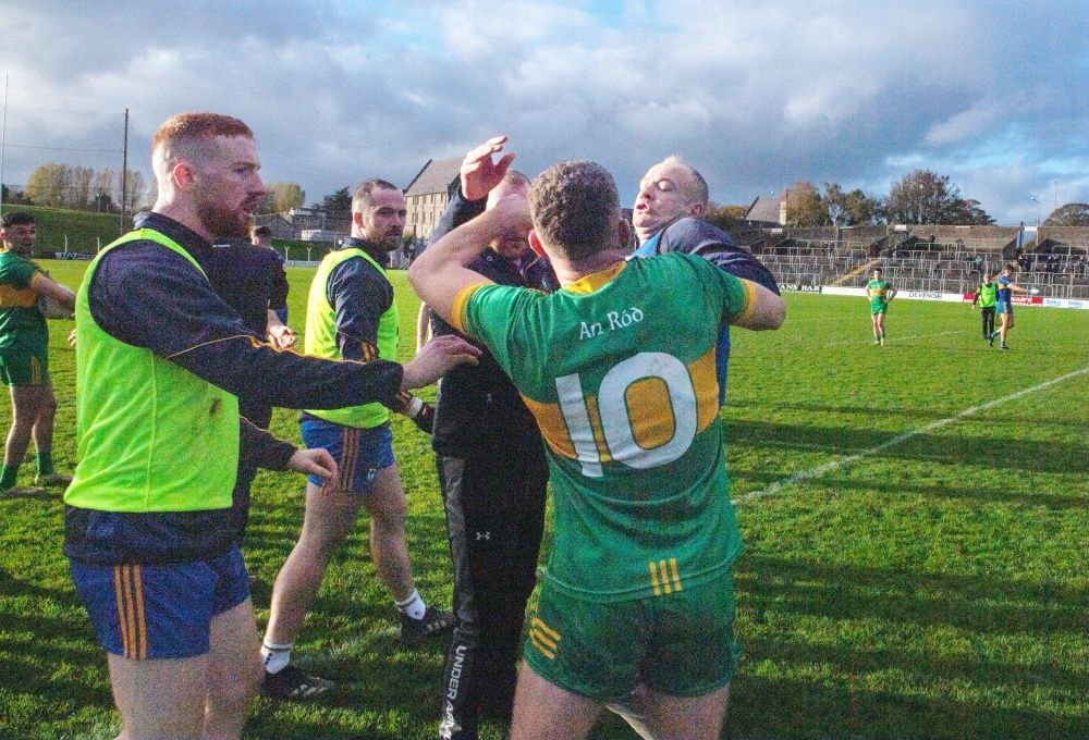 6 November 2022; Ratoath manager David Brady tussles with Anton Sullivan of Rhode after the AIB Leinster GAA Football Senior Club Championship quarter-final match between Ratoath and Rhode at Páirc Tailteann in Navan, Meath. Photo by Eóin Noonan/Sportsfile