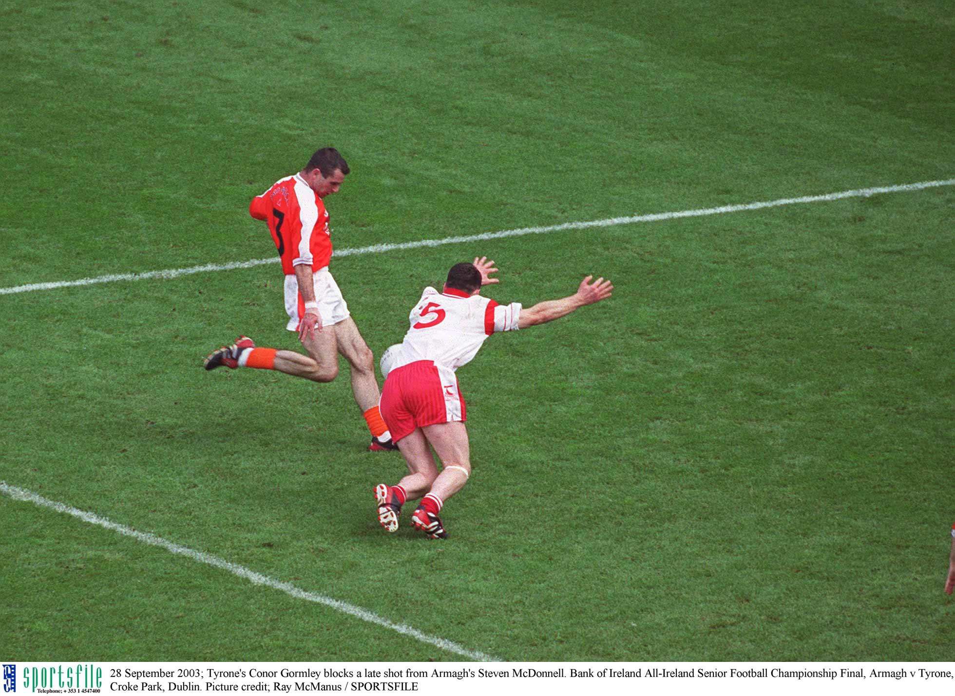 28 September 2003; Tyrone's Conor Gormley blocks a late shot from Armagh's Steven McDonnell. Bank of Ireland All-Ireland Senior Football Championship Final, Armagh v Tyrone, Croke Park, Dublin. Picture credit; Ray McManus / SPORTSFILE