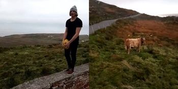 But we doubt any sports scientist would advise using a cow as target practice while punting a Sherrin off a wall in what looks like a wild part of Ireland’s west coast.