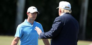 DORAL, FL - MARCH 06: Republican presidential candidate Donald Trump makes an appearance prior to the start of play and speaks with golfer Rory McIlroy of Northern Ireland during the final round of the World Golf Championships-Cadillac Championship at Trump National Doral Blue Monster Course on March 6, 2016 in Doral, Florida. (Photo by Mike Ehrmann/Getty Images)