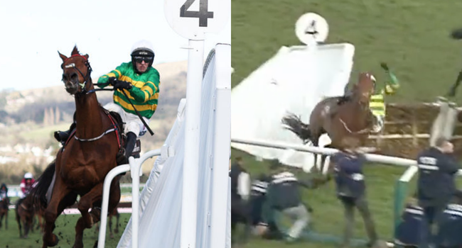 There was huge drama in the Albert Bartlett Novice’s hurdle as favourite Corbett’s Cross ran out before jumping the last fence.