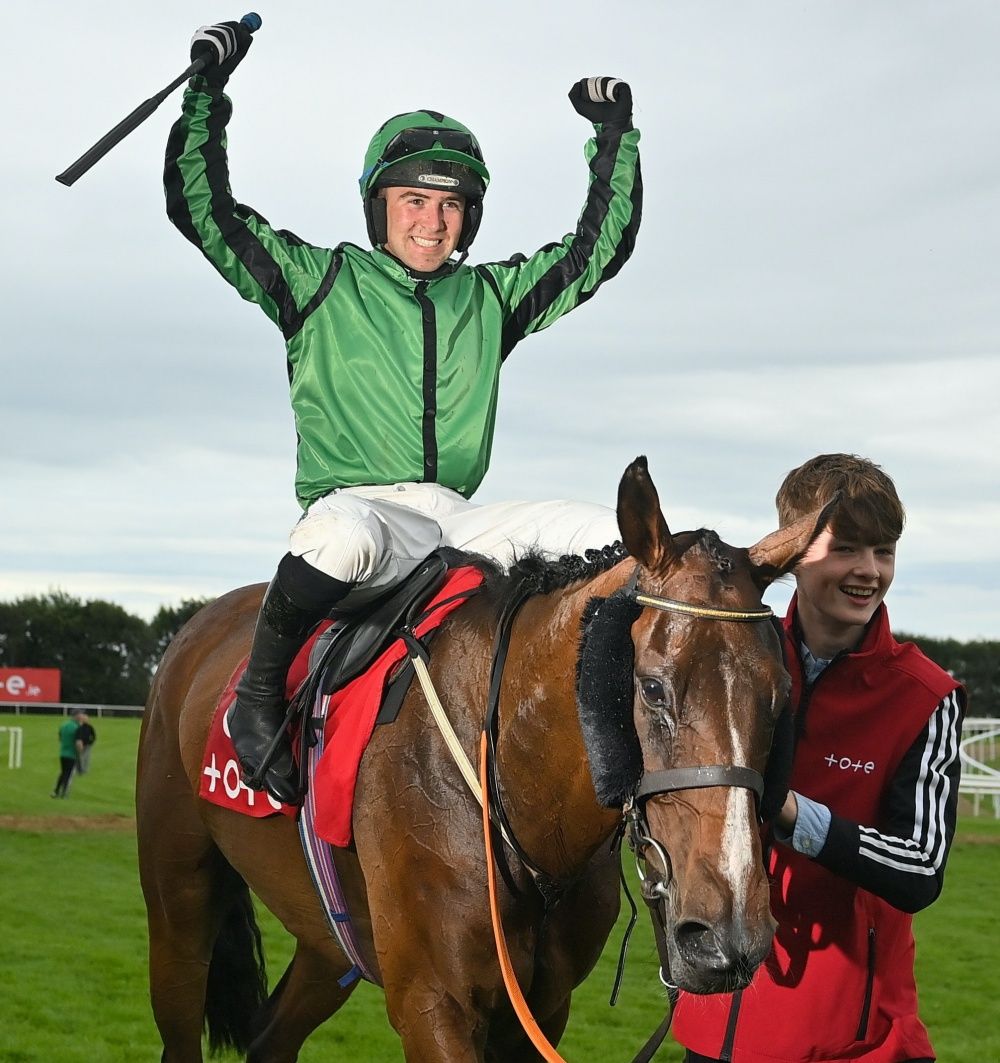 27 July 2022; Jockey Jordan Gainford celebrates on Hewick after winning the Tote Galway Plate during day three of the Galway Races Summer Festival at Ballybrit Racecourse in Galway. Photo by Seb Daly/Sportsfile