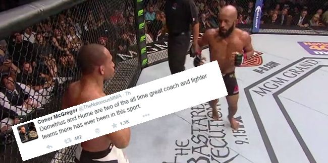 Demetrius and Hume are two of the all time great coach and fighter teams there has ever been in this sport. — Conor McGregor (@TheNotoriousMMA) September 6, 2015