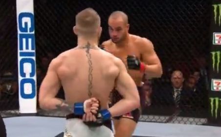 One of the stand-out images of UFC 205 must have been Conor McGregor facing off against then-lightweight champion Eddie Alvarez with his hands behind his back.