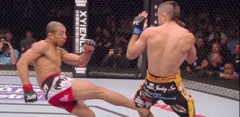 Aldo recognised that Lamas was throwing a lot of kicks early, and this knowledge prompted him to consistently check his opponent’s leg kicks and dodge the ones up top.