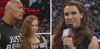 Dwayne “The Rock” Johnson got into a confrontation with Triple H and Stephanie McMahon at Wrestlemania. The Rock left the ring after McMahon slapped him, claiming that he would never hit a woman.Then in true Hollywood fashion, The Rock called UFC champion Rousey, his Fast and Furios 7 co-star, into the ring.