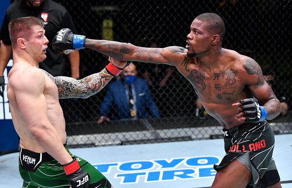 LAS VEGAS, NEVADA - APRIL 10: In this handout image provided by UFC, (R-L) Kevin Holland punches Marvin Vettori of Italy in a middleweight fight during the UFC Fight Night event at UFC APEX on April 10, 2021 in Las Vegas, Nevada. (Photo by Chris Unger/Zuffa LLC via Getty Images)