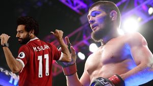 NEW YORK, NY - APRIL 07: Khabib Nurmagomedov celebrates his win over Al Iaquinta (not shown) to capture the UFC lightweight championship at UFC 223 at Barclays Center on April 7, 2018 in New York City. (Photo by Ed Mulholland/Getty Images)
