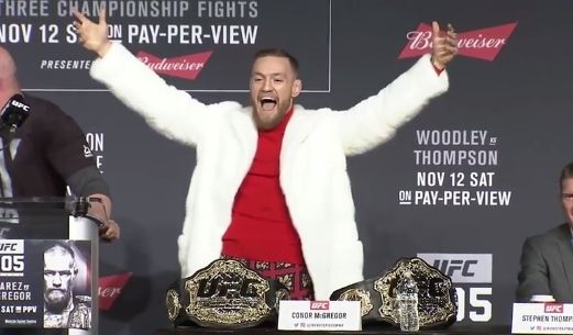 But when he arrived 30 minutes late for Thursday’s UFC 205 press conference in New York he took the stage in a red roll neck sweater and snow white fur coat.