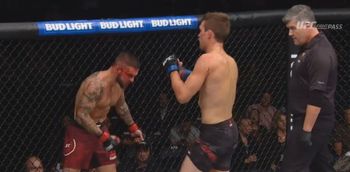 He stood watching as Tucker’s face was literally smashed in over the course of three rounds. In the final round when it became obvious that a comeback wasn;t on the cards, the ref was transfixed as Tucker ate 109 strikes and returned fire with just seven of his own.