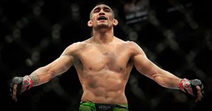 LAS VEGAS, NV - DECEMBER 06: Tony Ferguson celebrates after defeating Abel Trujillo in their fight during the UFC 181 event at the Mandalay Bay Events Center on December 6, 2014 in Las Vegas, Nevada. (Photo by Alex Trautwig/Getty Images)