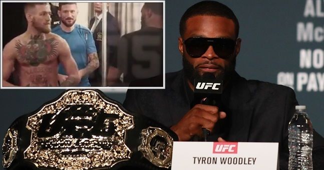After successfully weighing in ahead of the lightweight title fight that will headline Saturday night’s UFC 205 card, ‘The Notorious’ came face to face with UFC welterweight champion Tyron Woodley and neither man backed down.