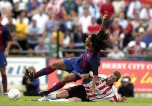 12 August 2003; Ronaldinho De Asis, Barcelona, in action against Derry City's Eamon Doherty. Friendly game, Derry City v Barcelona, Brandywell, Derry. Picture credit; David Maher / SPORTSFILE *EDI*