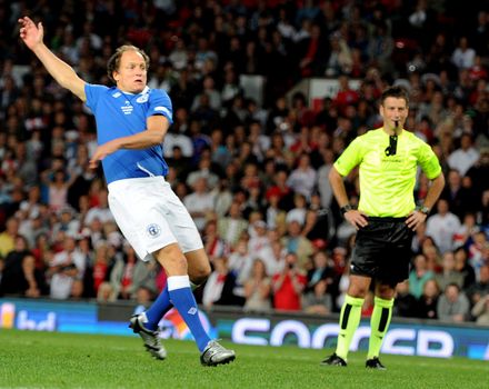 What former West Ham player scored twice for the World XI when they played in 2008?