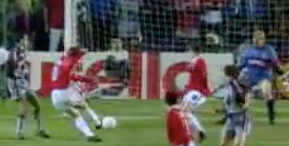 Who scuffed the initial shot that led to Teddy Sheringham's equaliser in the 1999 Champions League final?