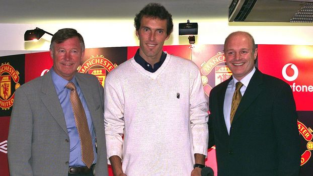 Name the former France defender that is posing with Alex Ferguson and Peter Kenyon after his transfer to Manchester United in 2001