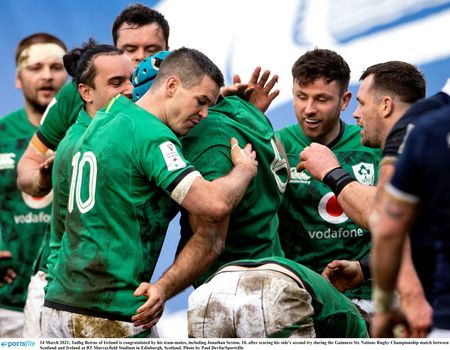 Who scored Ireland's first try in their 27-24 win over Scotland?