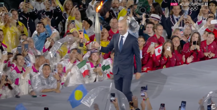 First, who did French football legend Zinedine Zidane pass the torch to during the opening ceremony in Paris?
