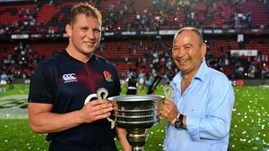 SANTA FE, ARGENTINA - JUNE 17: Dylan Hartley of England celebrates with Eddie Jones, Head Coach of England following victory during the ICBC Cup match between Argentina and England at Estadio Brigadier General Estanislao Lopez on June 17, 2017 in Santa Fe, Santa Fe. (Photo by Dan Mullan/Getty Images,)