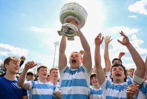 3 April 2022; Mikey Yarr of Blackrock College celebrates with the trophy after the Bank of Ireland Leinster Rugby Schools Senior Cup Final match between Gonzaga College and Blackrock College at the RDS Arena in Dublin. Photo by Harry Murphy/Sportsfile