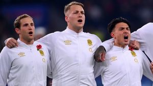 LONDON, ENGLAND - NOVEMBER 13: Marcus Smith of England and his teammates sing the national anthem prior to the Autumn Nations Series match between England and Australia at Twickenham Stadium on November 13, 2021 in London, England. (Photo by Laurence Griffiths/Getty Images)