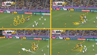 As Ben Youngs passes out of the ruck, Owen Farrell receives it, with Maro Itoje, Billy Vunipola and Kyle Sinckler outside him in that order. The Australians are highlighted above by number, loosehead Scott Sio, lock Rory Arnold and hooker Tolu Latu all ready for the English attack if they keep it tight.
