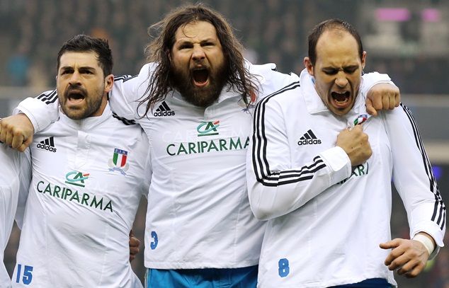 Italy’s Andrea Masi, Martin Castrogiovanni and Sergio Parisse sing the national anthem