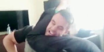 The scrum-half seems to have the better of his opponent as they tussle on a bed, but in a move that Conor McGregor would be proud of,Jones twists his hips to allow him get Murray in a headlock and bring him to submission.