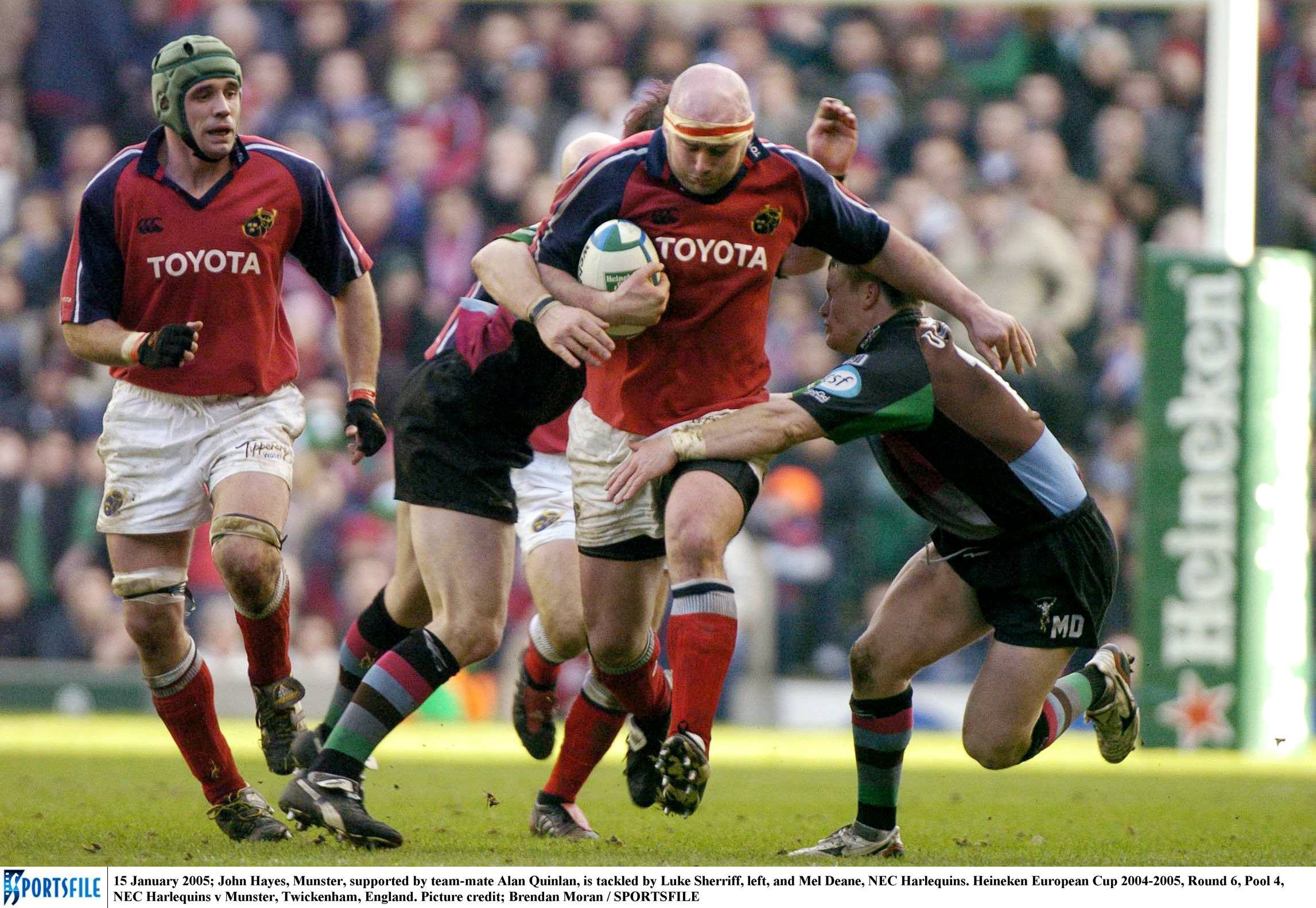 15 January 2005; John Hayes, Munster, supported by team-mate Alan Quinlan, is tackled by Luke Sherriff, left, and Mel Deane, NEC Harlequins. Heineken European Cup 2004-2005, Round 6, Pool 4, NEC Harlequins v Munster, Twickenham, England. Picture credit; Brendan Moran / SPORTSFILE