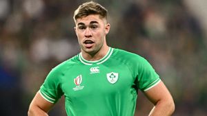 23 September 2023; Jack Crowley of Ireland during the 2023 Rugby World Cup Pool B match between South Africa and Ireland at Stade de France in Paris, France. Photo by Harry Murphy/Sportsfile