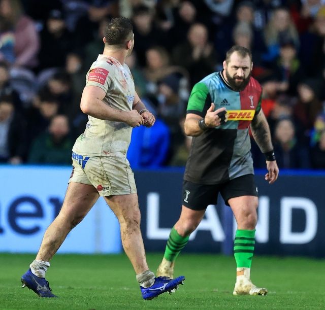 LONDON, ENGLAND - JANUARY 08: Joe Marler, (R) points the way to Alec Hepburn of Exeter Chiefs after Hepburn is sent off during the Gallagher Premiership Rugby match between Harlequins and Exeter Chiefs at Twickenham Stoop on January 08, 2022 in London, England. (Photo by David Rogers/Getty Images)
