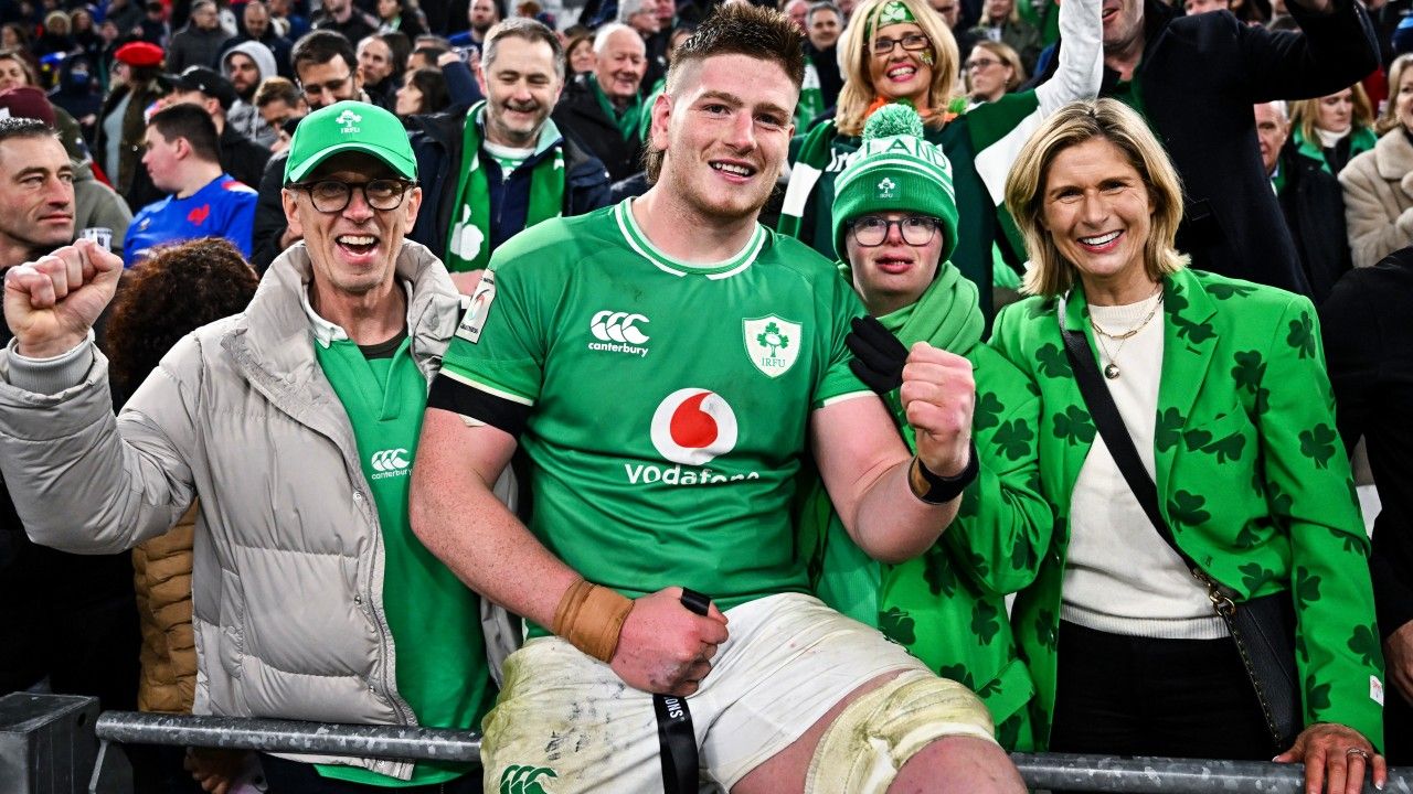 2 February 2024; Joe McCarthy of Ireland with his parents Joe and Paula, and brother Andrew after his side's victory in the Guinness Six Nations Rugby Championship match between France and Ireland at the Stade Velodrome in Marseille, France. Photo by Harry Murphy/Sportsfile