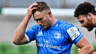 The Leinster medics rushed on to assist the 23-year-old but it was immediately clear that he was in a bad way. Larmour grimaced as his arm was assessed and it looks to be a shoulder dislocation that ended his second outing of the season. He was replaced by Jimmy O’Brien for the final 30 minutes.