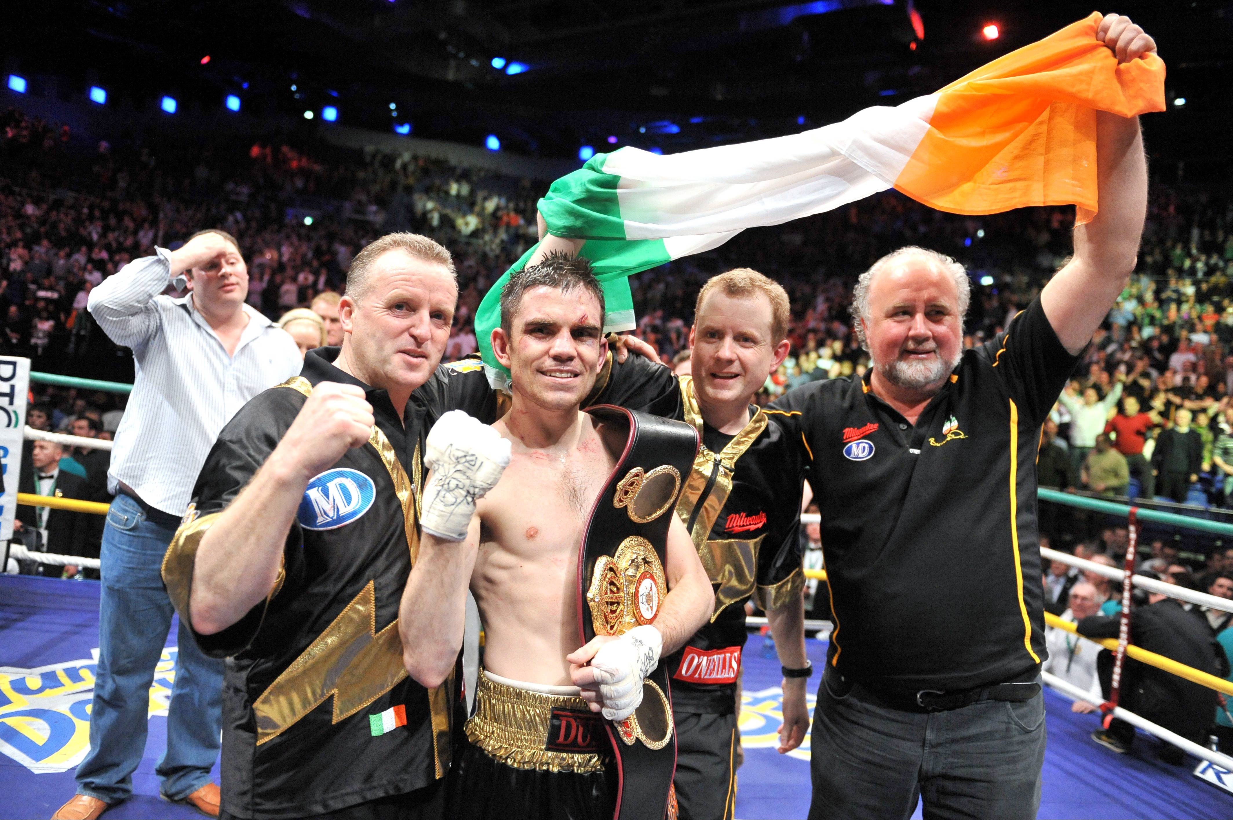 21 March 2009; Bernard Dunne celebrates with, from left, trainer Harry Hawkins, promoter Brian Peters, and sponsor Martin Donnelly after victory over Ricardo Cordoba to win the WBA World Super Bantamweight title. Hunky Dory World Title Fight Night, Bernard Dunne v Ricardo Cordoba, The O2, Dublin. Picture credit: David Maher / SPORTSFILE