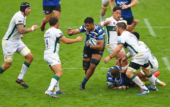 Taulupe Faletau of Bath Rugby takes on Nick Phipps of London Irish and Sean O'Brien of London Irish during the Gallagher Premiership Rugby match between Bath Rugby and London Irish at The Recreation Ground on August 15, 2020 in Bath, England. (Photo by Michael Steele/Getty Images)