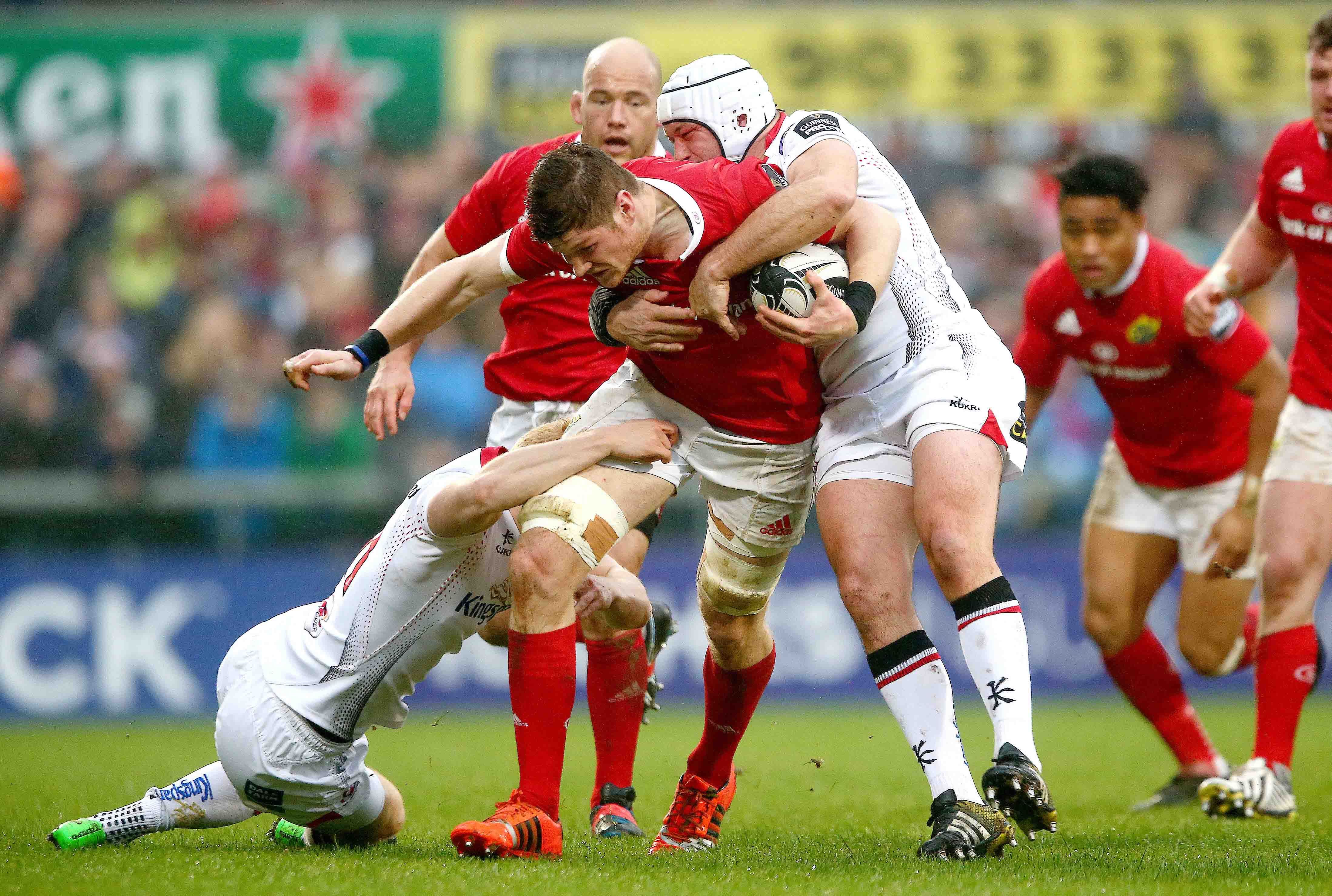 Ulster's Rory Scholes and Rory Best with Jack O'Donoghue of Munster