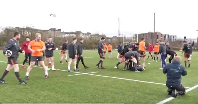 Munster Rugby players Jean Kleyn and Robin Copeland rushed to slag teammate Simon Zebo after he was sidestepped by hooker Mike Sherry in training.