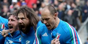 Lorenzo Cittadini, Leonardo Ghiraldini, Quintin Geldenhuys, Martin Castrogiovanni and Sergio Parisse during the National anthems