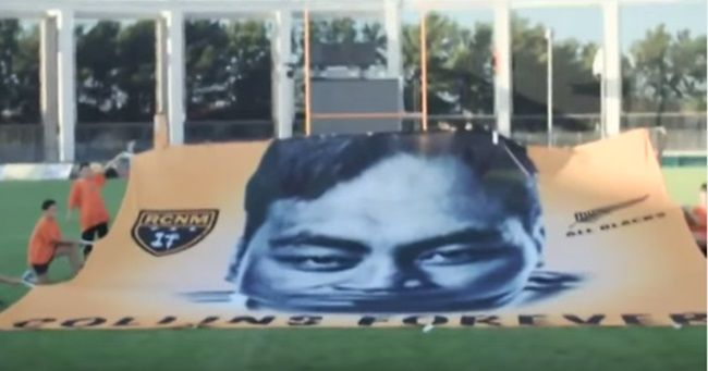 The Narbonne players took part in a fantastic haka ahead of their season opener against Aix en Provence before unfurling a giant banner with the message “Collins Forever” emblazoned across it.